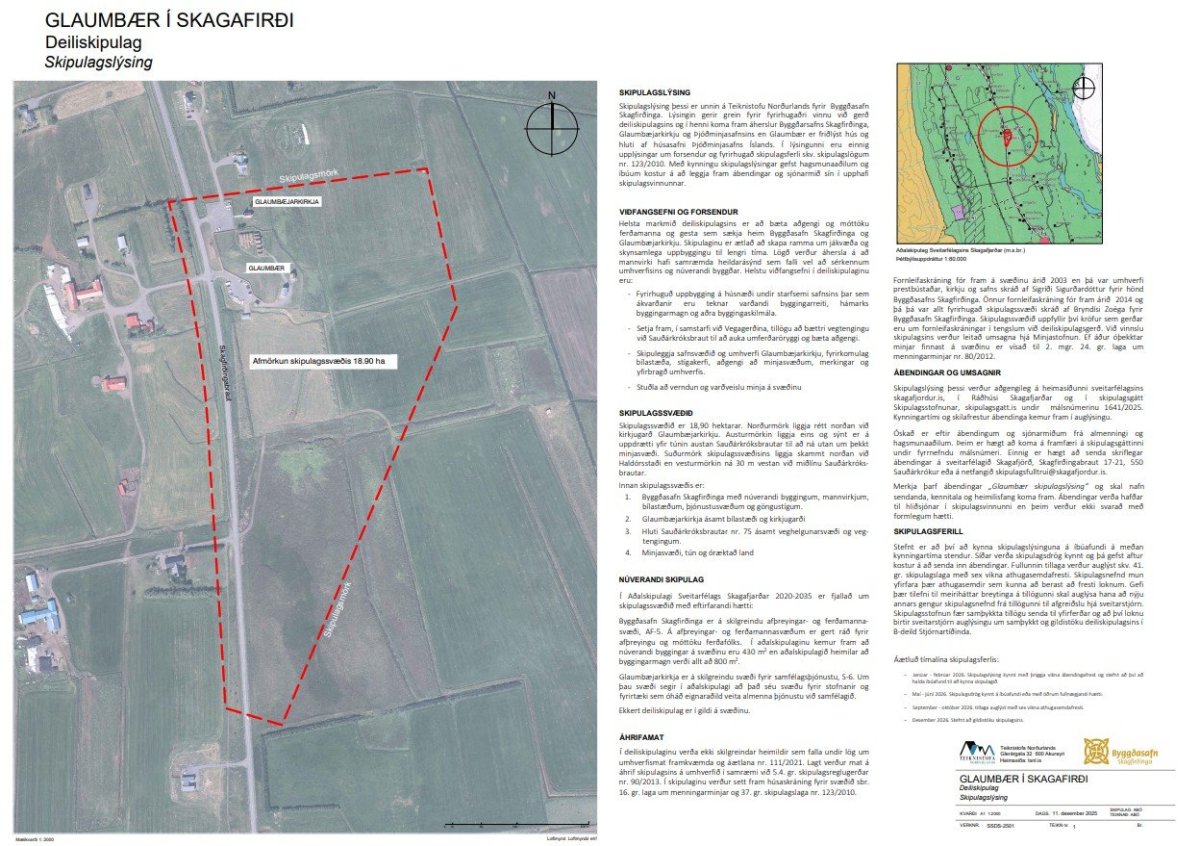 Sveitarstjórn Skagafjarðar samþykkti á 45. fundi sínum þann 21. janúar 2026 að auglýsa skipulagslýsingu fyrir "Byggðasafn Skagfirðinga í Glaumbæ" skv. 40 gr. skipulagslaga nr. 123/2010.